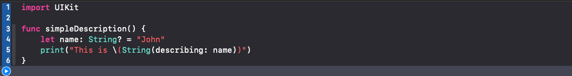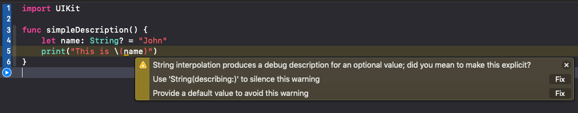 I think the idea is that you may overlook that you are converting an optional to a String and accidentally display the ugly details to the user. 5 here で説明here Swiftのリフレクション機能を使用してこの拡張機能を使用してクラスに独自の. Module_globals if supplied should be the global namespace in use by the code for which the warning is issued.